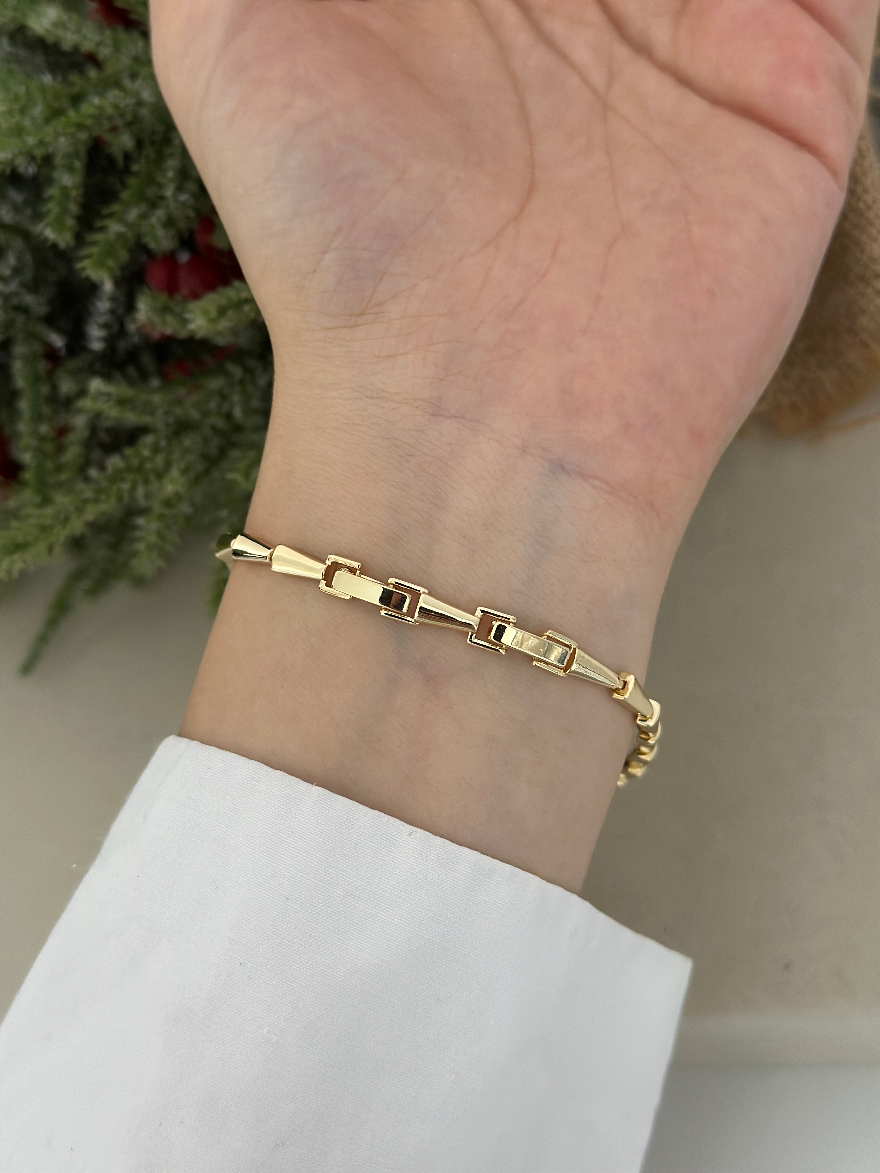 Materyali yüksek kalite pirinç üzeri 14k altın kaplamadır. Üzerinde ki taşlar zirkondur. Ürün uzunluğu 20 cm,ek klipssiz 18 cm'dir. Alerji testinden başarı ile geçtiği için hassas ciltler için de uygundur.Uzun süreli kullanım ve parlaklığını kaybetmemesi için parfüm, deterjan gibi kimyasallarla temas etmemesi önerilir.
